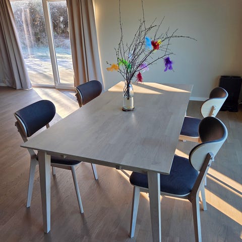 Spisegruppe i lys eik. Bordplaten er pusset og oljet, vedlikeholdt. Understell i heltre eik. Bordplaten er i mdf med fine’r. Komfortable stoler i heltre eik, hardplast og skai som er lett å rengjøre. Selges samlet med fire stoler.