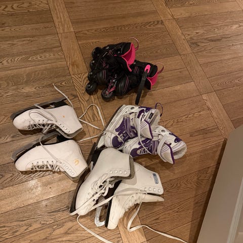 Barneskøyter i hvitt med størrelse 35. Skøytene har snøring og dekorative detaljer. Egnet for barn og til bruk på is for skøyting.