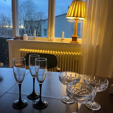 Fem stilige champagneglass av ukjent merke selges samlet for 100,- Gulldekor er noe slitt av, noe som gir et «crabby chic» preg, men glassene er for øvrig i topp stand.