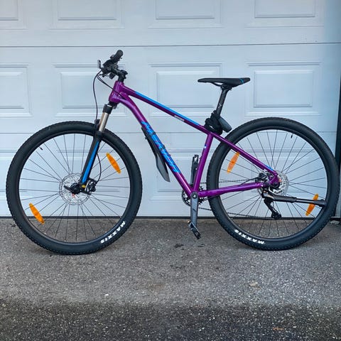 Følger med asfalt dekk, terreng dekk, og piggdekk. SPD pedaler.