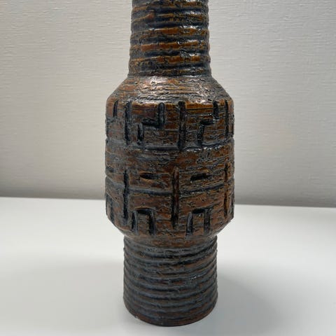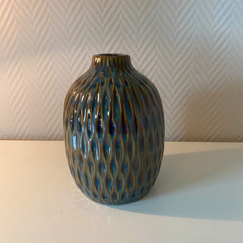 Dekorativ liten keramikkvase i lys grå/grønn glasur med pent, strukturert mønster. Passer fint til små blomster, tørkede strå – eller som ren interiørdetalj på bord, hylle eller i vinduskarm.