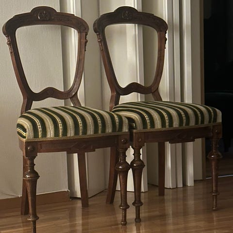 Selger to svarte stoler fra IKEA. Sete og ryggstøtte er i plast, rammen er i metall