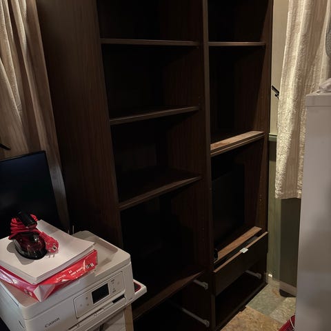 Trådkurv-kommode gis bort mot henting. Denne har brun ramme og hvite trådkurver. Tre dype kurver og fire mindre.