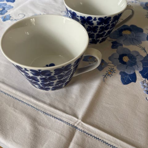 Rörstrand Mon Amie terrin med lokk i keramisk materiale. Kjelen har blått blomstermønster på hvit bakgrunn og to håndtak for enkel håndtering. Egnet for bruk i kjøkkenet til oppbevaring eller servering av mat.
