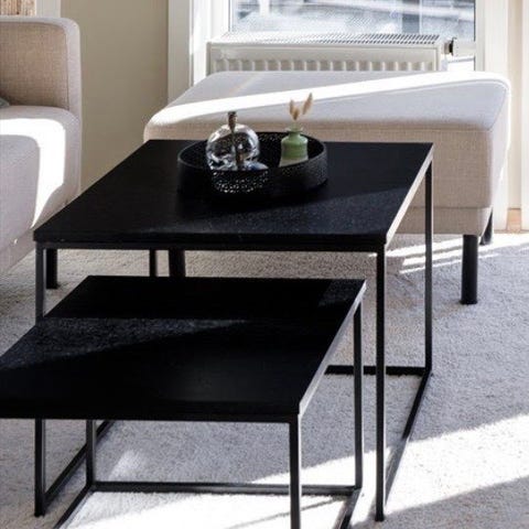 Selger et helt nytt sett med salongbord/sidebord fra Bohus. Ø60 H38 /Ø47 H31 lakkert eikefiner brun med metall svart ben. Ny pris 2699 kr.
