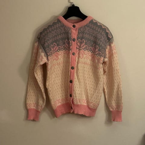 Selger en hvit foret ull genser i størrelse 44 for kvinner. Den har høy hals med glidelås og tradisjonelt mønster på brystet. Genseren er foret på innersiden og passer til bruk i kaldt vær.
