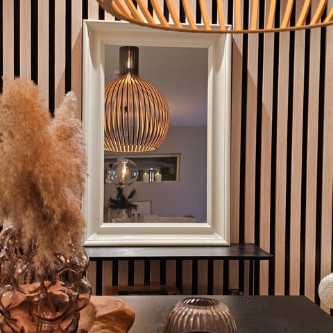 Kan henges på veggen eller settes på en kommode (takket være stabil ramme).