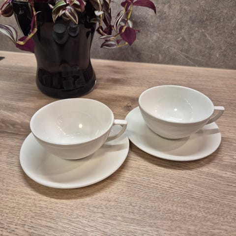 Jasper Conran white Tekopp med skål fra Wedgewood . Stilren, frenstilt i hvit benporselen, designet i et moderne, men klassisk design som lett passer inn i et hvert hjem.