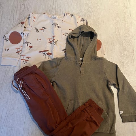 Fint brukte klær med noen mindre bruksmerker (små flekker på en genser, ikke forsøkt å fjerne de, lite synlig).