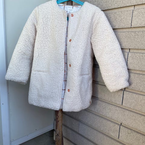 Blå kåpe for jente i størrelse 116. Kåpen har lange ermer og knappestolpe foran. Egnet for barn i denne størrelsen.