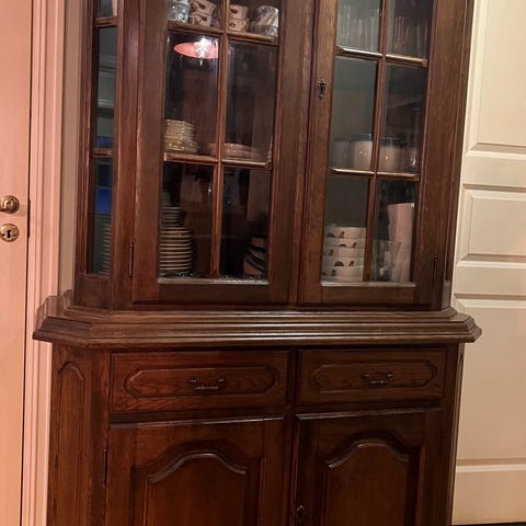 Vitrineskap laget i tre med to glassdører øverst og to lukkede underskap. Skapet har detaljer i treverk med synlig årringstruktur og messinghåndtak. Passer til oppbevaring og visning av glass, servise og dekorative gjenstander.Skapet er høyt, har stått i gammelt hus med høy takhøyde