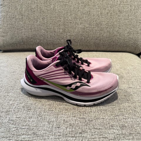 Saucony Kinvara 14 løpesko i størrelse 42. Skoene har en rød farge med svarte og gule detaljer. Egnet for løping.