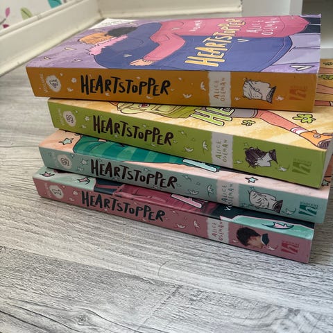 Heartstopper tegneserie bokserie av Alice Oseman, består av fire bøker med fargerike omslag. Serien følger karakterene Charlie og Nick i en ungdomsfortelling. Bøkene er på engelsk og passer for lesere som er interessert i grafiske romaner og ungdomslitteratur.
