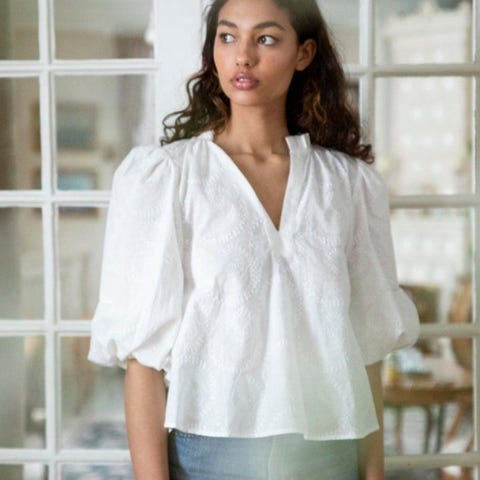 En flytende bluse laget av 100% økologisk bomull, med plisserte detaljer på brystet og et beskåret utseende. Leveres med lange puffy ermer med elastikk på enden. Den perfekte delikate høstblusen.