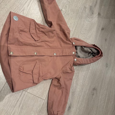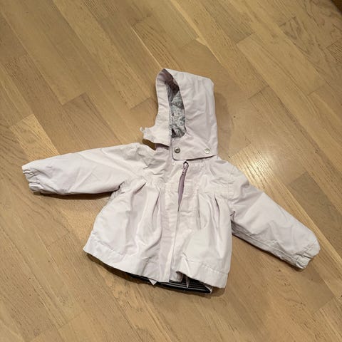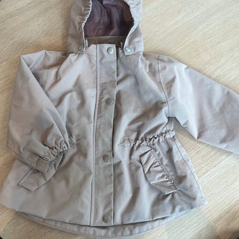 Wheat barnejakke i størrelse 80 for jente. Jakken har flerfarget mønster, avtagbar hette og snøring i livet.