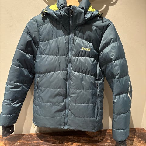 Bergans dunjakke for barn i størrelse 164, unisex modell. Jakken er grønn og laget med dun som isolasjonsmateriale, egnet for å gi varme i kaldt vær.