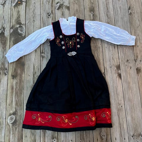 Pent brukt, rød og sort bunad. Hvit skjorte følger med.