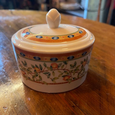 Den er 15 cm høy. Diameter 12 cm - lengde med håndtak og tut er 21 cm