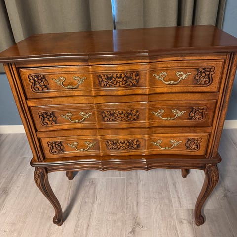Veldig pen og sjelden kommode antatt å være fra 50-60 tallet. Usikker på verdi, men dette er veldig fin håndverk.