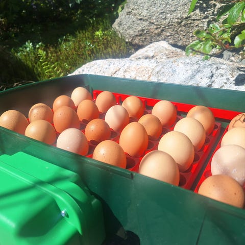 Plass til 7 hønseegg i den, noen flere vaktelegg som den er brukt til, men følger å med ett ekstra brett slik at det er plass til over 18 egg inni der.