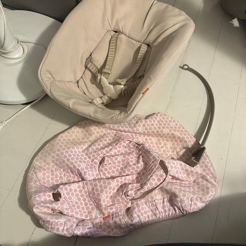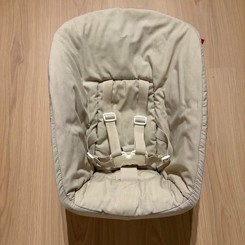 Stokke barnestol med polstret sete og sikkerhetssele. Stolen har et mykt, grått trekk og en avtagbar arm til leke. Lite og pent brukt. Må hentes.