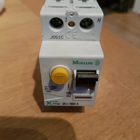 Moeller PFIM-25/2/003-A jordfeilbryter med en strømstyrke på 25 ampere og 2-polet design. Enheten har en testknapp for funksjonssjekk og er egnet for elektriske installasjoner som krever jordfeilbeskyttelse.