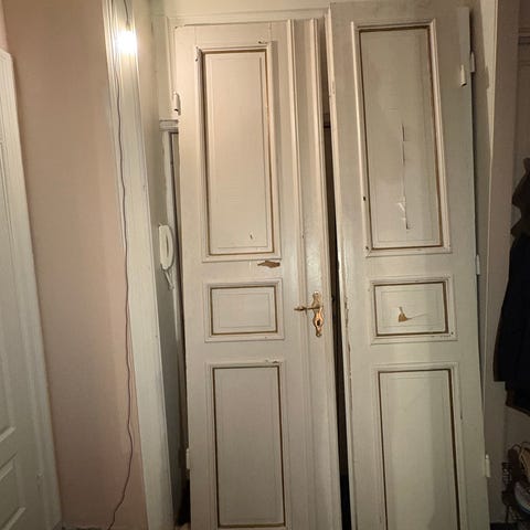Nydelige originale doble innerdører laget av tre. Selges da vi skal rive veggen og ikke har plass til de. Kjempe fine fløydører og godt tatt vare på.
