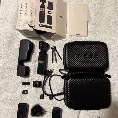 DJI Osmo Pocket kompakt kamera med tilbehør inkludert batterilader, mikrofon med vindbeskyttelse, og ekstra kabler. Kameraet er designet for bærbar bruk og tilbyr stabilisering for videoopptak. Passer for brukere som ønsker en liten og lett kameraenhet for video og fotografering.