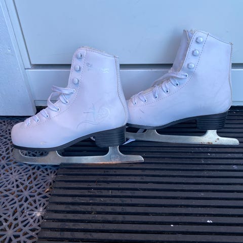Graf Justerbare ishockey skøyter for barn i størrelse 34. Skøytene er hvite med lilla detaljer og laget for ishockey. Justerbar størrelse fra 31 til 34.