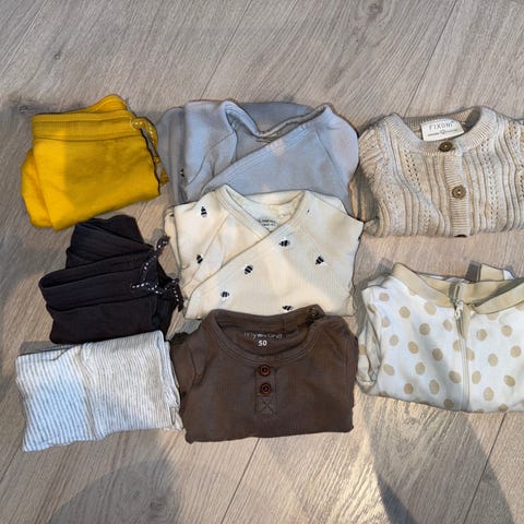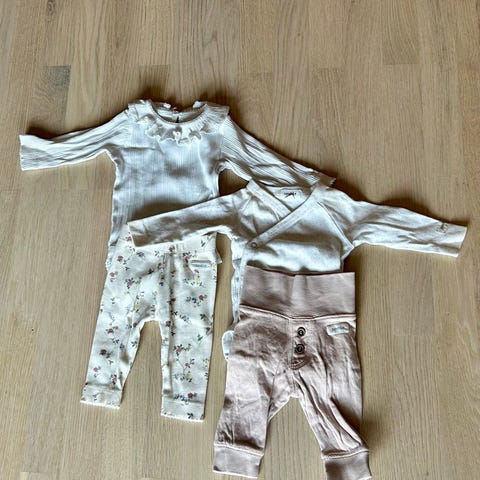 To kjoler fra Newbie, fire bukser fra Newbie, fire bodyer fra henholdsvis Cubus, Name it og HM (to stykk). Alt i størrelse 56, bortsett fra bodene fra HM som er i størrelse 62 (men små i størrelsen).