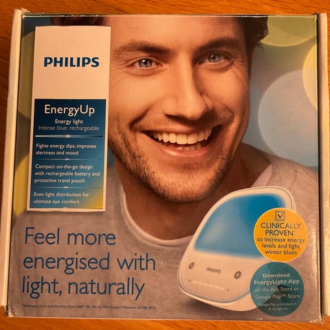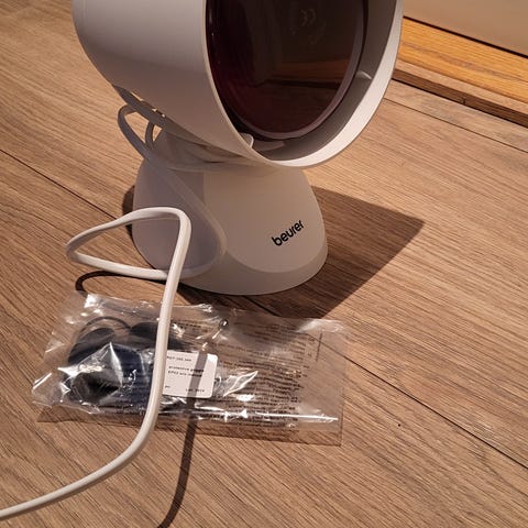 Selge ren pent brukt Beurer TL 41 Touch Dagslyslampe. Dette er en lampe som simulerer sollys, som kan øke energinivå og kan ha virkning på vinterdepresjon.