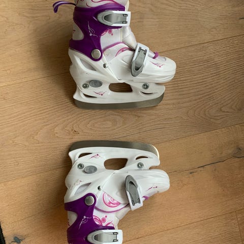 barneskøyter i størrelse 28-31, justerbar. Skøytene har en kombinasjon av rosa, hvit og svart farge. Egnet for barn og laget for generell skøyting.