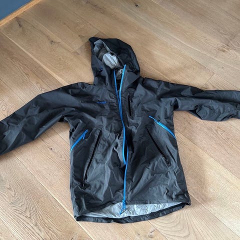 Bergans jakke i størrelse M, laget av nylonmateriale. Jakken har en grå farge og er designet for utendørs bruk.