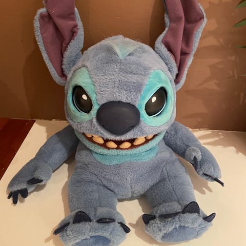 Disney live action Stitch. Hånddukke. Stitch blunker, smiler, nikker og reagerer på berøring takket være avansert teknikk og hånd-støttet dukking. Har over 100 forskjellige lyder og bevegelser Inkluderer sertifikat for førsteutgave av autentisitet.