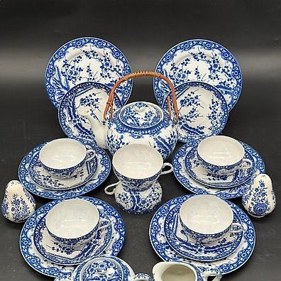 Rörstrand servise med et grønt blomstermønster. Inneholder et utvalg av tallerkener, kopper, skåler og serveringsfat i porselen. Passer til daglig bruk og spesielle anledninger.