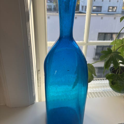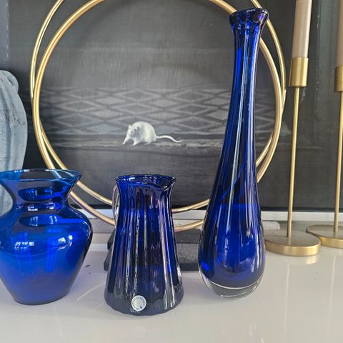 Blå glass dekorasjonsgjenstander bestående av flere ulike former og størrelser. Produktene er laget i blått glass og kan brukes til dekorasjon i hjemmet. 100,- pr gjenstand. Høyde mellom 20 cm - 30 cm på vasene. Fat 27 cm diameter. Fat med stett 21 cm diameter høyde 21 cm. Stort glass congnac form 25 cm høy. Avlangt fat 36 cm. Sender ikke. Må hentes Romsås, Oslo.