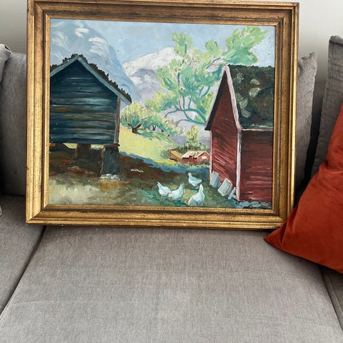 Klarer ikke lese signatur, ei heller skrift på baksiden. Fremstår fra ca 1950 pga lerret og motiv (se bilde med tekst fra søk)