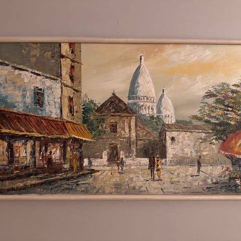 Signert oljemaleri, kirken Sacré-Ceur i bakgrunnen i ekspresjonistisk stil.