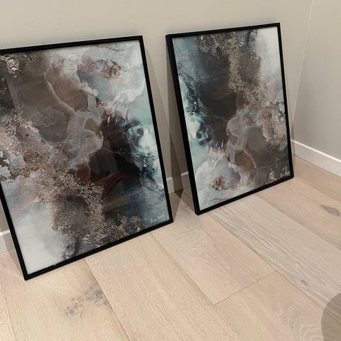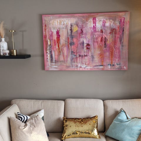 Abstrakt kunst malt av meg 🎨 akryl på lerret. Malt lagvis i rosatoner med gull i et mykt utrykk🌟signert og klart til å henges opp... 120×80 cm...Det koster evt 331,- å sende det inkludert et håndterings tilegg.
