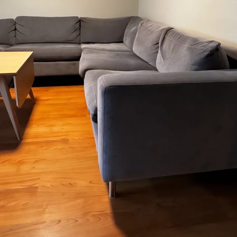 Må hentes. Sofaen kan deles opp i to moduler for frakt.