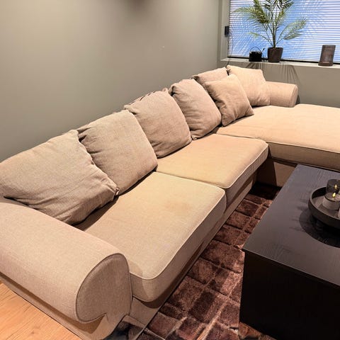 Veldig glad i sofaen, men litt for stor for mitt lille hus. Sett forfra så er sjeselong på høyre side.