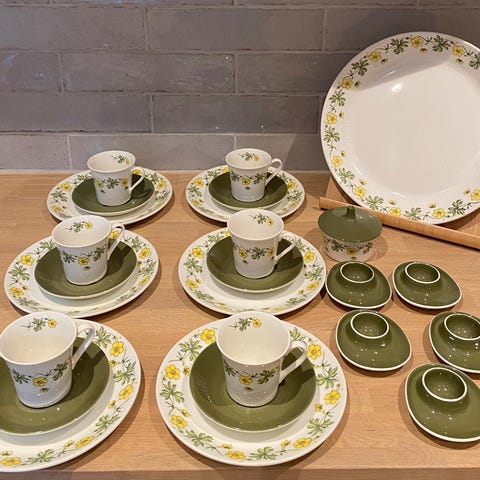 Noen deler er godt brukt, andre deler nesten ikke brukt. Noen kopper er krakelert. Selger helst alt samlet. Gi bud. Må hentes på Ullern i Oslo.