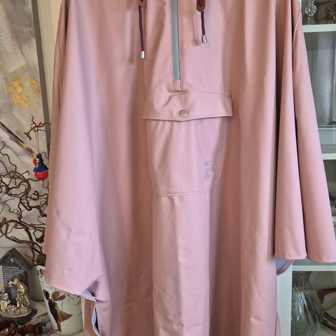 Praktisk poncho som skjermer godt mot både regn og vind. To lommer og man kan velge om man vil ha knyting i livet eller la den henge løs.
