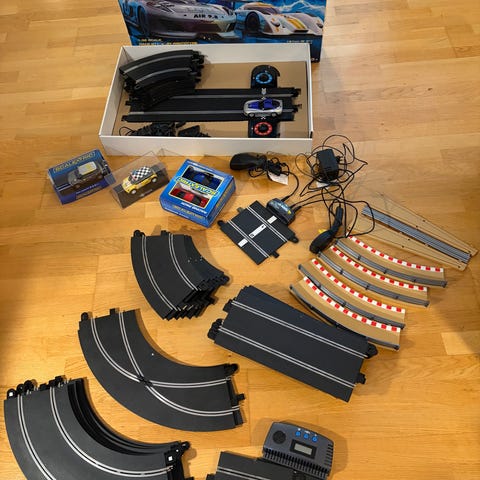 Scalextric bilbane med flere biler, noen må byttes børste på, andre kjører som de skal! Selges samlet