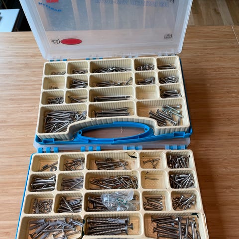 Galvanisert firkantspiker 75 og 90 mm. Ca. 500 av hver. Noe er usortert, men kun ubrukt spiker. Litt over 500 stk. galvanisert kammet pistolspiker 90 mm. I tillegg ca. 400 kamnagler 40 mm. Det er også en eske med stifter til pistol til lister, 50 mm. Er til overs fra et byggeprosjekt