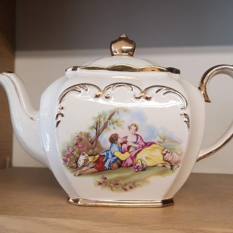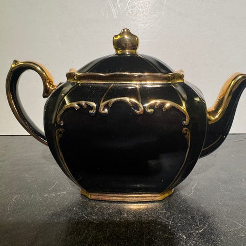 Dekoren og gullkantene tyder på at dette er en Art Deco-inspirert tekanne fra 1920-tallet, som stemmer med årstallet 1925, men er usikker