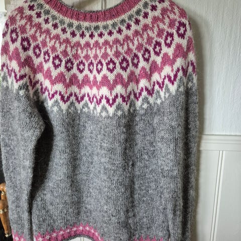 Mønsteret heter Afmæli,og er strikket i Lettlopi. Léttlopi er løst spunnet garn av 100% ren, islandsk ull.