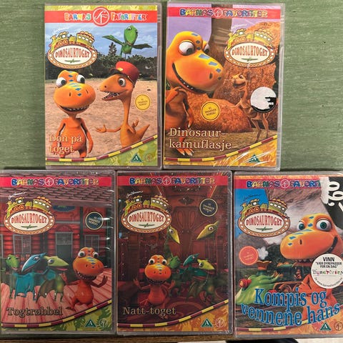Selger tre koselige og lærerike Dinosaurtoget-DVD-er – populære favoritter for barn som liker dinosaurer, eventyr og lek kombinert med enkel læring.