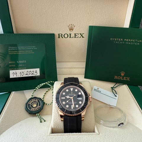 Selger min Rolex Yacht-Master 40 rosegull, ref. 126655, kjøpt ny i Norge i 2022.