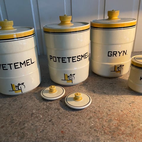 Dette er Egersund Fayance kjøkkenbeholdere, også kalt kryddersett eller spiseri.